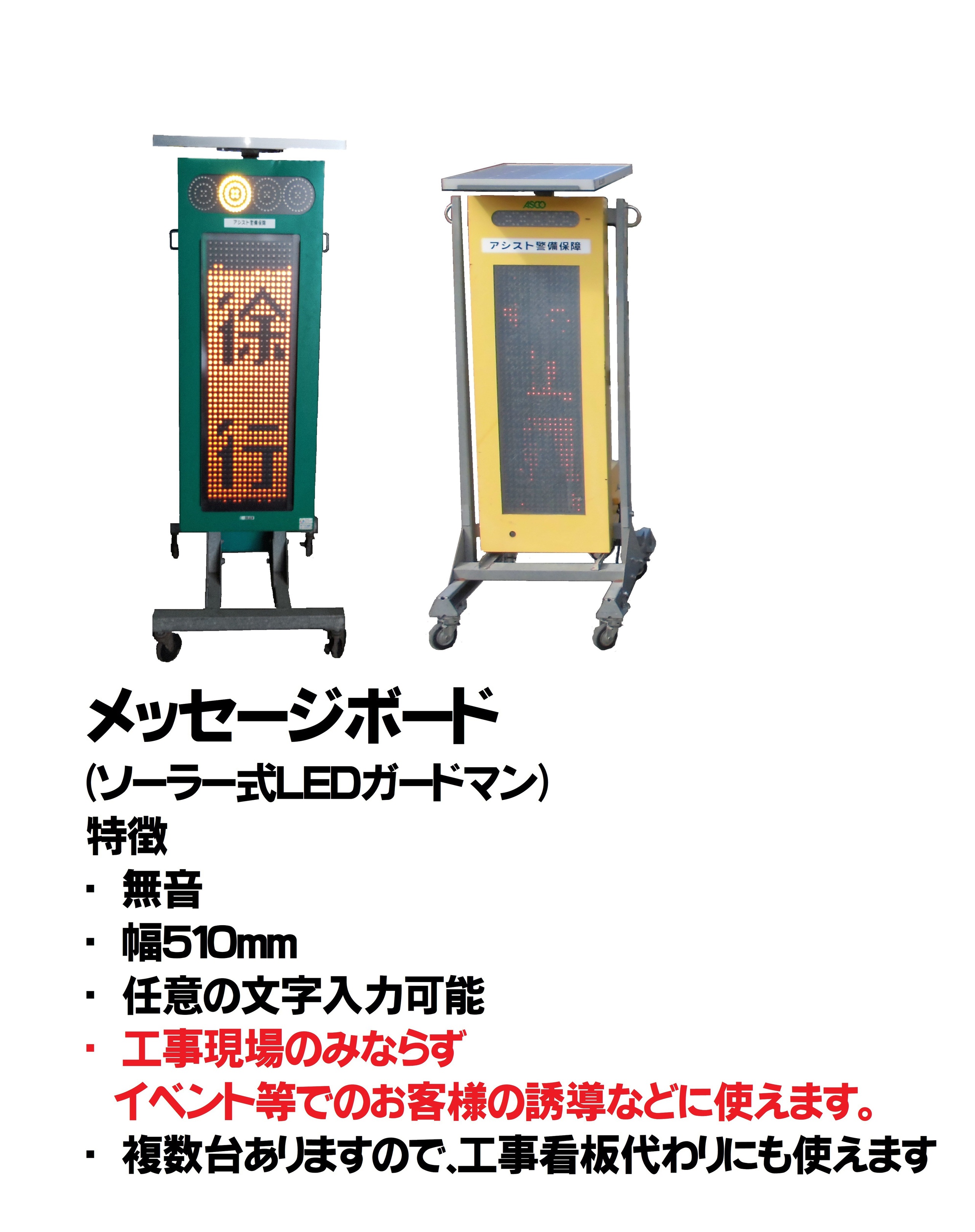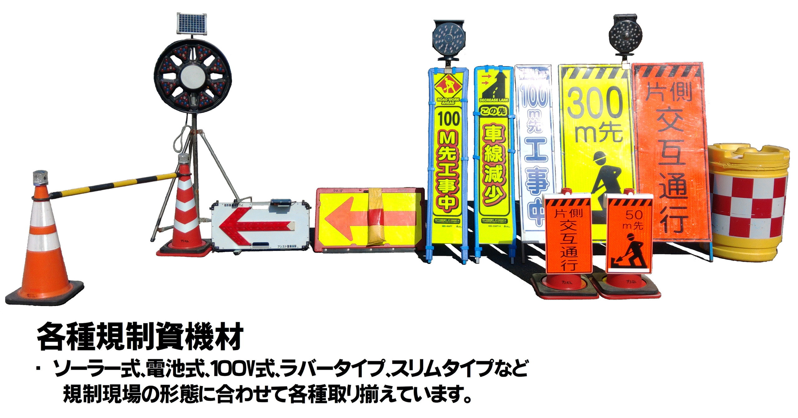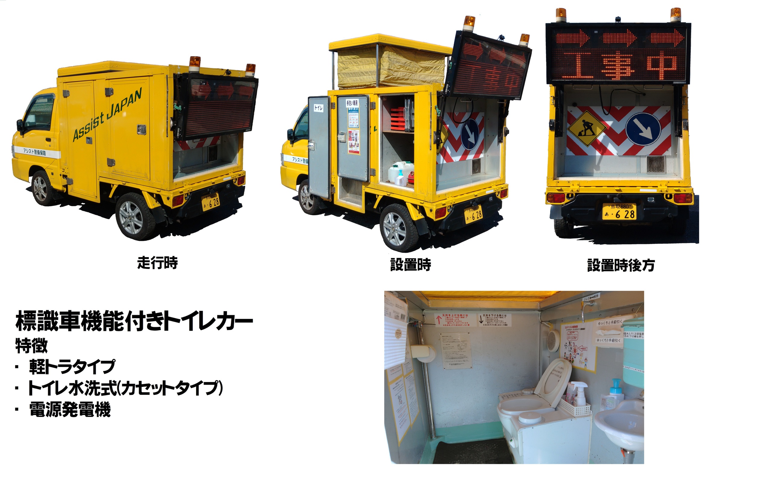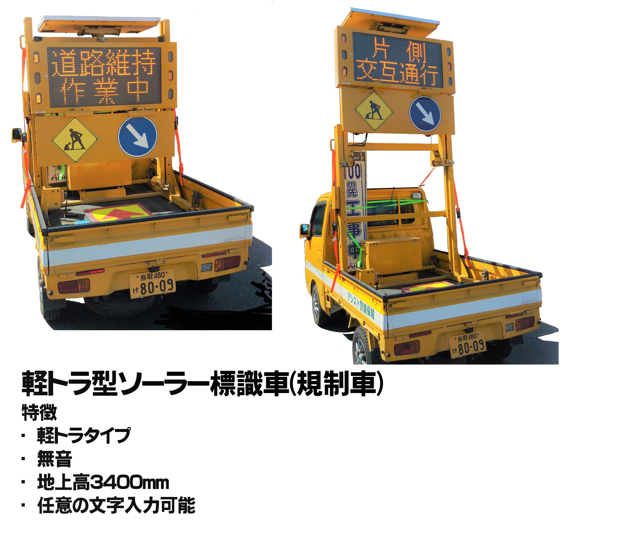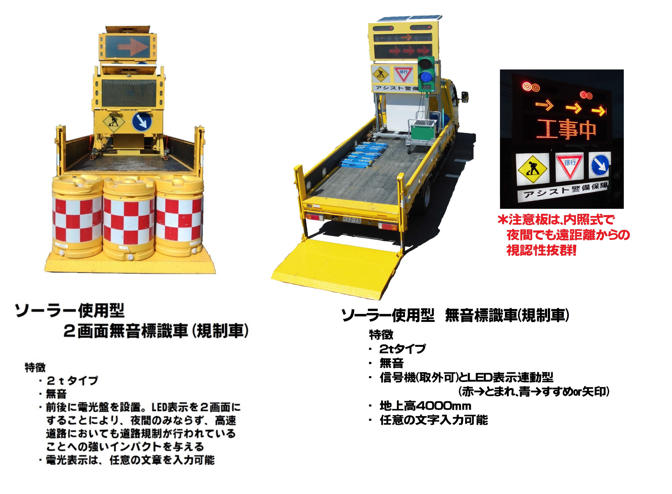 高速道路から一般道・・・そしてイベントまで幅広くアシストします! ソーラー使用型 無音標識車(規制車) 発電機使用型 標識車(規制車) 資材車(運搬車) 標識車機能付きトイレカー 軽トラ型標識車 パトロールカー メッセージボード(LEDガードマン) LEDガードマン 小型電光板 とまるくん ソーラー信号機 リモコン信号機 橋梁点検車 各種規制資機材 熱中症対策 ご用命の際は、お気軽にお問合せください。